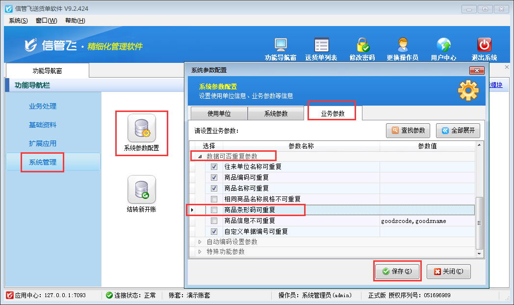 在系統(tǒng)管理—》系統(tǒng)參數(shù)配置—》業(yè)務(wù)參數(shù)內(nèi)將“數(shù)據(jù)可否重復(fù)參數(shù)”中的“商品條形碼可重復(fù)”參數(shù)的勾選取消,然后保存設(shè)置。如下圖所示: