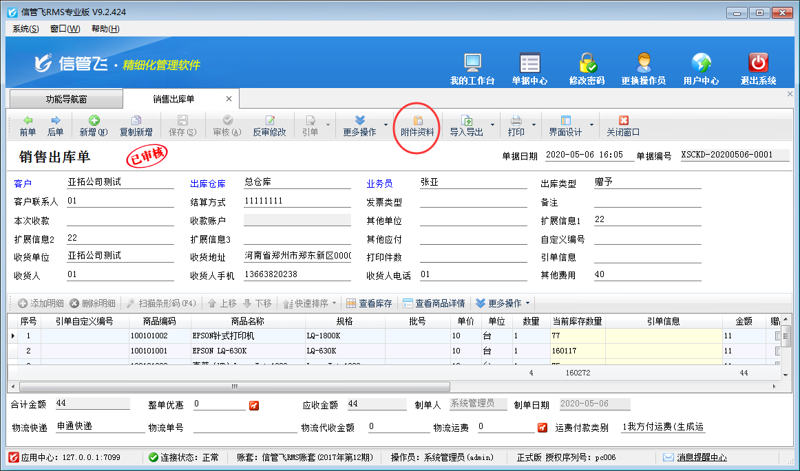 操作員權(quán)限設(shè)置完成后,選擇操作員“張亞”登錄軟件,打開一個銷售出庫單,然后可以看到銷售出庫單界面工具欄已查看不到“附件資料”功能,操作員將無法再查看附件資料。