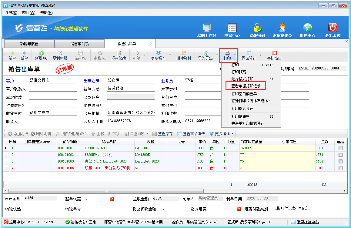 在銷售出庫單界面工具欄點擊“打印”—》“查看單據打印記錄”可以打開查看單據打印記錄界面,如下圖所示,可以查看本單打印記錄,跟蹤記錄單據每次打印情況,如每次打印使用的打印格式模板、打印機名稱、打印時間及每次打印操作人員名稱等。