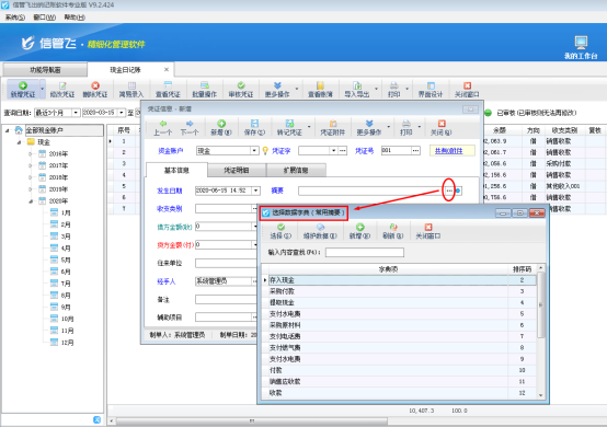 設置完成之后,在功能導航窗點擊“出納管理”——》“現金日記賬”,新增現金日記賬,摘要無法直接輸入,只能點擊摘要后面的“...”按鈕進行選擇,如下圖所示: