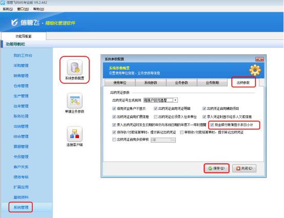 在功能導(dǎo)航窗點(diǎn)擊“系統(tǒng)管理”——》“系統(tǒng)參數(shù)配置”即可打開(kāi)“系統(tǒng)參數(shù)設(shè)置”界面,點(diǎn)擊“出納參數(shù)”,系統(tǒng)默認(rèn)勾選“現(xiàn)金銀行賬簿顯示本日小計(jì)”參數(shù),如圖1所示。