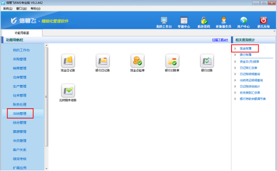 點(diǎn)擊功能導(dǎo)航窗中的“出納管理”,在界面右側(cè)“相關(guān)查詢統(tǒng)計(jì)”下點(diǎn)擊“現(xiàn)金賬簿”,如圖2所示。
