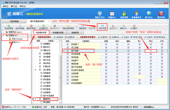 信管飛送貨單軟件、信管飛RMS(進銷存管理軟件)、信管飛倉庫管理軟件等都支持管理基礎資料信息和允許設置多個操作員進行登錄軟件。軟件支持將基礎資料信息以EXCEL的形式導出放到自定義的文件夾內(nèi)以便備份或保存,如果需要設置操作員不允許導出客戶信息,如何設置?本文以進銷存管理軟件為例,示范下如何設置操作員不可導出客戶信息。