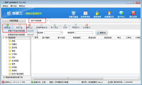 信管飛送貨單軟件、信管飛RMS軟件等支持按客戶管理商品價格信息,前期使用軟件沒有客戶最近商品價格,軟件支持通過導入導出方式,可把整理好的商品價格信息批量導入軟件中,本文以“信管飛送貨單軟件”為例,示范下如何批量導入客戶價格信息?