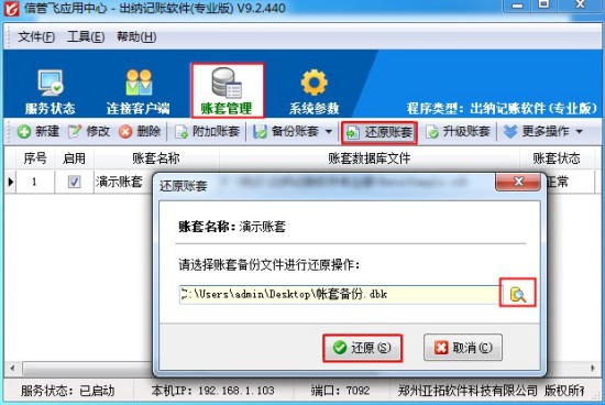 點擊“備份帳套”后會在桌面上生成一個名稱為“帳套備份.dbk”的文件(名稱可自己取),復制到新電腦上,在新電腦上安裝下軟件,軟件安裝包可在官網上下載(軟件下載地址),然后在應用中心程序帳套管理界面點擊“還原帳套”,選擇復制過去的備份文件進行還原,如下圖所示: