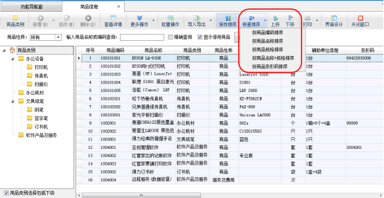 登錄軟件,在功能導(dǎo)航窗點“基礎(chǔ)資料”—》“商品信息”即可進(jìn)入“商品信息”界面,如圖1所示,點“排序設(shè)置”按鈕,可進(jìn)行排序,點“快速排序”會按照字母順序自動排序,包括“按商品編碼排序”、“按商品名稱排序”、“按商品規(guī)格排序”“按商品名稱+規(guī)格排序”、“按商品條形碼排序”這五種快速排序方法;點“上移”、“下移”按鈕可向上、向下調(diào)整顯示位置,如圖2所示: