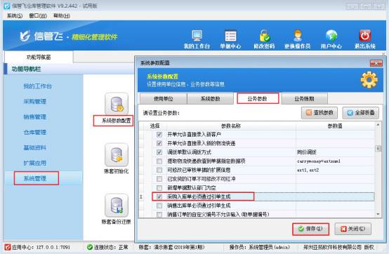 在功能導(dǎo)航窗選擇“系統(tǒng)管理”—》“系統(tǒng)參數(shù)配置”在業(yè)務(wù)參數(shù)的“業(yè)務(wù)單據(jù)相關(guān)參數(shù)”中勾選啟用參數(shù)“采購入庫單必須通過引單生成”,保存參數(shù)配置。如下圖所示:
