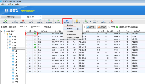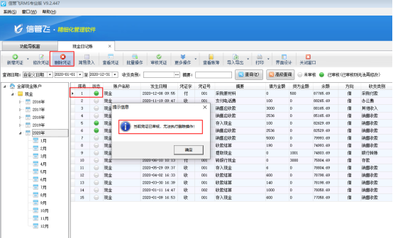 信管飛RMS標準版和專業(yè)版都包括登記出納日記賬憑證功能,在新增保存日記賬憑證后都可以直接審核憑證,憑證審核后,不允許直接刪除。客戶如果需要刪除已審核的憑證,需要先反審憑證,再進行刪除。下面我們介紹一下在信管飛RMS專業(yè)版中如何刪除已審核的日記賬憑證?