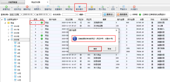 在現(xiàn)金日記賬列表界面,如圖2所示,點擊“更多操作”—》“反審憑證”,系統(tǒng)彈出提示信息“您確定要反審當前憑證?”,點擊“確定”按鈕,如圖3所示。