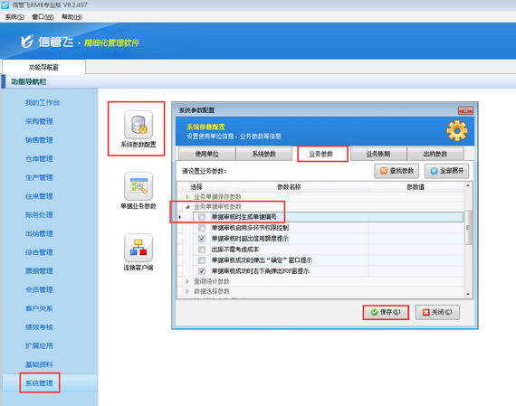 在功能導(dǎo)航窗點(diǎn)擊“系統(tǒng)管理”—》“系統(tǒng)參數(shù)配置”—》“業(yè)務(wù)參數(shù)”,即可進(jìn)入到“業(yè)務(wù)參數(shù)”配置界面,如下圖所示,在業(yè)務(wù)單據(jù)審核參數(shù)內(nèi)找到“單據(jù)審核時(shí)生成單據(jù)編號(hào)”參數(shù)。