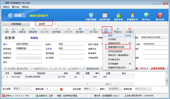 信管飛送貨單軟件、信管飛RMS軟件等支持自定義打印模板,可選擇不同模板打印單據,可根據參數設置控制打印次數,跟蹤記錄單據每次打印情況,本文示范下如何查看單據打印記錄?