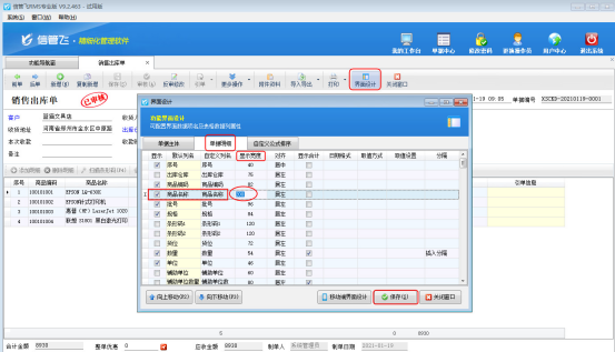 在銷售出庫單界面點擊“界面設計”按鈕,系統彈出界面設計窗口,在單據明細里面找到“商品名稱”這個數據項后,顯示寬度可自己根據實際情況手動修改,例如,默認寬度是143,此次我們錄入200,然后點擊“保存”,如圖2所示。
