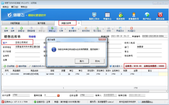 本文以“信管飛RMS標準版為例”,示范下如何鎖定超出信用額度的客戶。超出信用額度的客戶“亞拓公司測試”在未設置鎖定前,開銷售出庫單審核單據會提示“當前往來單位將會超出應收信用額度,是否繼續”,點擊“是”仍可以保存成功,如下圖所示: