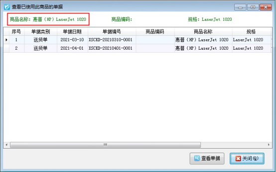 在功能導航窗選擇“基礎資料”—》“商品信息”進入商品信息界面,對于重復的已開單商品點擊刪除按鈕后仍存在此商品,刪除不了,可選擇此商品,點擊工具欄“更多操作”下的“查看已使用此商品的單據(jù)”,可查看到已開單記錄,如下圖所示: