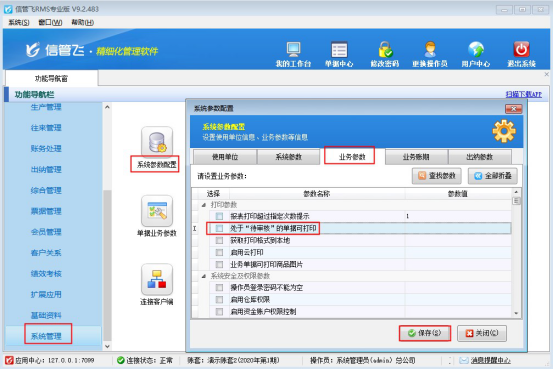 信管飛RMS軟件、信管飛倉庫管理軟件中單據(jù)支持保存和審核兩個步驟,開單需要保存審核操作,審核后單據(jù)代表完成,為避免以下情況出現(xiàn):打印未審核狀態(tài)的單據(jù)后,又修改單據(jù),導致打印出的內(nèi)容和軟件中對不上,查詢修改記錄也查詢不到(已審核的單據(jù)修改后可查詢到修改記錄),建議設置“未審核”狀態(tài)的單據(jù)不能打印,本文以“信管飛RMS軟件”進行示范。