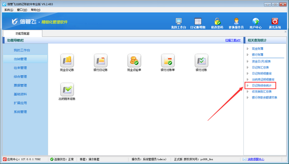 然后在“出納管理”模塊最右側(cè)的“相關(guān)查詢統(tǒng)計”內(nèi)點(diǎn)擊“日記賬綜合統(tǒng)計”,打開“日記賬綜合統(tǒng)計”界面,如下圖所示。