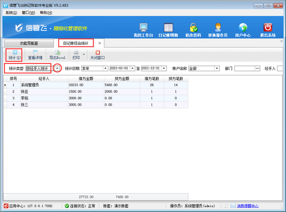 在“日記賬綜合統(tǒng)計”界面,統(tǒng)計類型選擇“按經(jīng)手人統(tǒng)計”,然后點(diǎn)擊“統(tǒng)計”按鈕,可以根據(jù)經(jīng)手人進(jìn)行統(tǒng)計。另外,系統(tǒng)支持根據(jù)日期、賬戶名稱、部門、經(jīng)手人等條件進(jìn)行統(tǒng)計查詢。