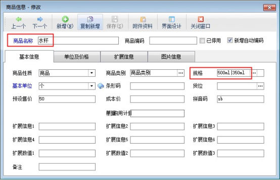 參數(shù)啟用保存后,在“基礎(chǔ)資料”—》“商品信息”中可添加商品,在規(guī)格中可區(qū)別開(kāi)規(guī)格內(nèi)容,示例商品:水杯(規(guī)格500ml和350ml),如下圖所示