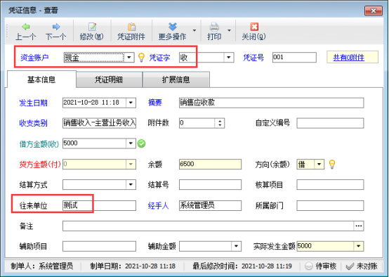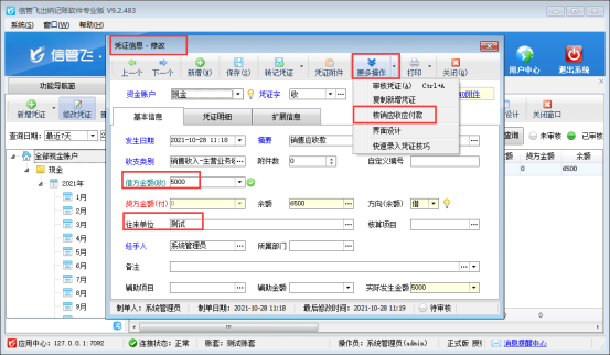 功能導(dǎo)航窗“往來(lái)管理”—》“應(yīng)收款管理”中,新增一筆客戶(hù)“測(cè)試”的應(yīng)收款記錄,應(yīng)收金額5000元,保存并轉(zhuǎn)記現(xiàn)金憑證,如下圖所示:
