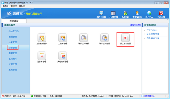 在功能導航窗點擊“綜合管理”—》“員工借款管理”即可進入“員工借款管理”界面,如下圖所示:
