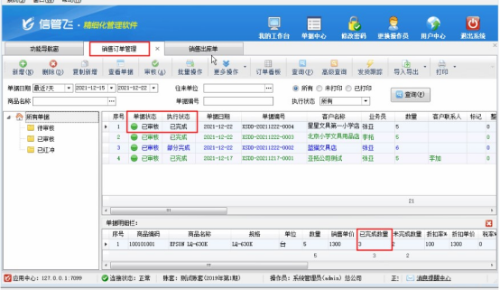 目前軟件對(duì)于手動(dòng)標(biāo)記為已完成狀態(tài)的訂單,后期如修改引用此訂單的出庫(kù)單數(shù)量,只要小于訂單數(shù)量,手動(dòng)標(biāo)記完成的訂單執(zhí)行狀態(tài)仍會(huì)自動(dòng)更新,變?yōu)椴糠滞瓿桑缦聢D:
