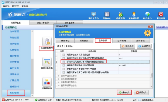 手動(dòng)標(biāo)記完成的訂單如需不再自動(dòng)更新執(zhí)行狀態(tài),軟件可設(shè)置參數(shù)控制,在功能導(dǎo)航窗點(diǎn)擊“系統(tǒng)管理”—》“系統(tǒng)參數(shù)配置”,在“業(yè)務(wù)參數(shù)”中的“業(yè)務(wù)單據(jù)相關(guān)參數(shù)”勾選啟用參數(shù)“手動(dòng)標(biāo)記完成的訂單不再自動(dòng)更新執(zhí)行狀態(tài)”,然后保存設(shè)置,如下圖所示: