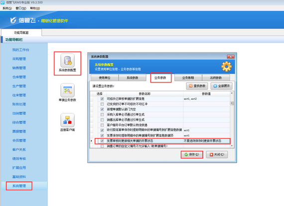 系統(tǒng)默認(rèn)發(fā)票保存時更新業(yè)務(wù)單據(jù)的開票狀態(tài),如需設(shè)置發(fā)票審核后更新業(yè)務(wù)單據(jù)的開票狀態(tài),可在功能導(dǎo)航窗點擊“系統(tǒng)管理”—》“系統(tǒng)參數(shù)設(shè)置”—》“業(yè)務(wù)參數(shù)”中找到并啟用參數(shù)“發(fā)票審核時更新相關(guān)單據(jù)的開票狀態(tài)”(不啟用則發(fā)票保存時更新相關(guān)單據(jù)的開票狀態(tài)),如下圖所示。