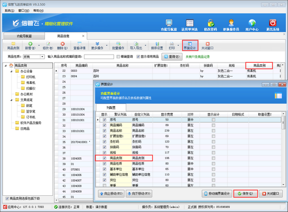 首先,在商品信息界面工具欄中點擊“界面設(shè)計”打開界面設(shè)計界面,將“商品類別”列配置顯示出來,如下圖所示。