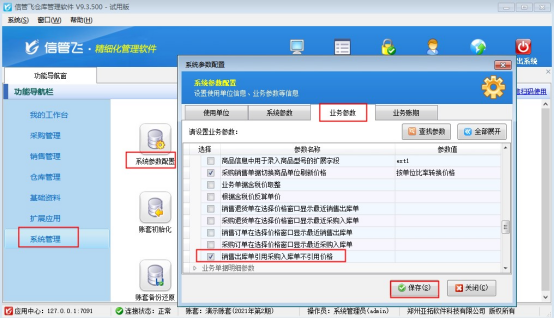 在功能導(dǎo)航窗點(diǎn)擊“系統(tǒng)管理”—》“系統(tǒng)參數(shù)配置”,“業(yè)務(wù)參數(shù)”中勾選啟用參數(shù)“業(yè)務(wù)單據(jù)價(jià)格參數(shù)”中的“銷(xiāo)售出庫(kù)單引用采購(gòu)入庫(kù)單不引用價(jià)格”,保存參數(shù)設(shè)置。如下圖所示: