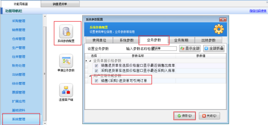 在功能導(dǎo)航窗點(diǎn)擊“系統(tǒng)管理”—》“系統(tǒng)參數(shù)配置”,進(jìn)入系統(tǒng)參數(shù)配置界面,點(diǎn)擊“業(yè)務(wù)參數(shù)”,勾選“銷售(采購)退貨單可引用訂單”參數(shù),點(diǎn)擊保存按鈕,如下圖所示: