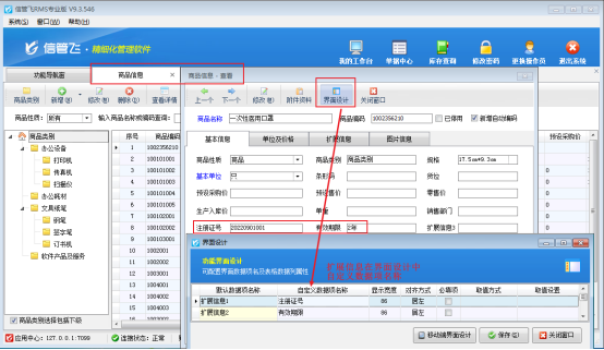 商品信息顯示商品固定屬性,需要在商品信息界面的“界面設(shè)計(jì)”中勾選顯示擴(kuò)展信息1擴(kuò)展信息2(對(duì)應(yīng)商品信息中的擴(kuò)展信息1擴(kuò)展信息2),自定義列名中可以修改為“注冊(cè)證號(hào)、有效期限”,可以移動(dòng)位置到需要顯示的位置,如下圖所示,可以看到商品信息界面商品屬性已正常顯示。