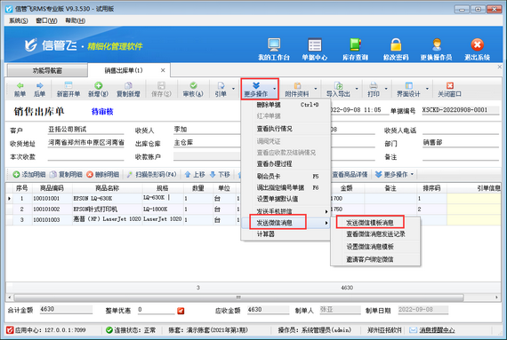 設(shè)置完成之后,使用操作員賬號“張亞”登錄軟件,打開一個銷售出庫單,然后點擊“更多操作”→“發(fā)送微信消息”→“發(fā)送微信模板消息”進(jìn)行發(fā)送微信消息通知時,系統(tǒng)會彈出提示信息“您沒有發(fā)送微信消息的權(quán)限,請于系統(tǒng)管理員聯(lián)系!”,如下圖所示。