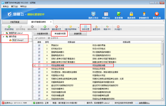 在功能導(dǎo)航窗點擊“系統(tǒng)管理”—》“操作員及授權(quán)”,可進(jìn)入“操作員管理及授權(quán)”界面,選中操作員賬號,在“其他操作權(quán)限”界面將“可發(fā)送微信消息”權(quán)限打鉤取消,然后保存權(quán)限設(shè)置,如下圖所示,設(shè)置操作員“張亞”沒有“可發(fā)送微信消息”權(quán)限。