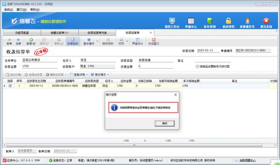 如修改收款結(jié)算單時(shí)提示:“當(dāng)前結(jié)算單是由業(yè)務(wù)單據(jù)生成的,不能反審修改”該如何操作?如下圖所示,本篇文章示范下操作步驟。