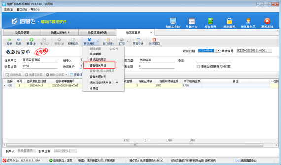 打開收款結(jié)算單界面,在工具欄更多操作下點(diǎn)擊“查看相關(guān)單據(jù)”,系統(tǒng)會(huì)直接打開相應(yīng)的銷售出庫單。可對銷售出庫單進(jìn)行反審修改操作,在銷售出庫單界面反審修改后,收款結(jié)算單即可同步修改。如下圖所示,修改銷售出庫單“本次收款賬戶”后,收款結(jié)算單可同步進(jìn)行修改。