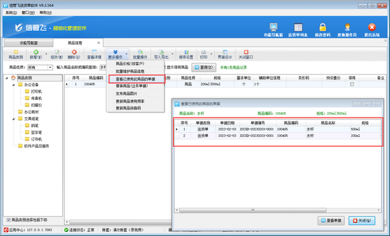 出現(xiàn)此問題的原因是:此商品在單據(jù)內(nèi)使用過,可在商品信息界面工具欄點(diǎn)擊“更多操作”下拉列表點(diǎn)擊“查看已使用此商品的單據(jù)”按鈕查看已使用此商品的單據(jù)詳情,如下圖所示。