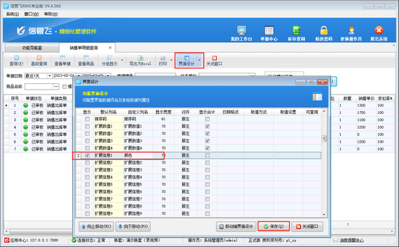 打開銷售明細查詢界面,工具欄點擊“界面設計”可以打開界面設計窗口,同樣找到默認列名為“擴展信息1”的數據項,將自定義列名修改為“顏色”,并勾選“顯示”出來,然后點擊“保存”按鈕保存界面設計配置。