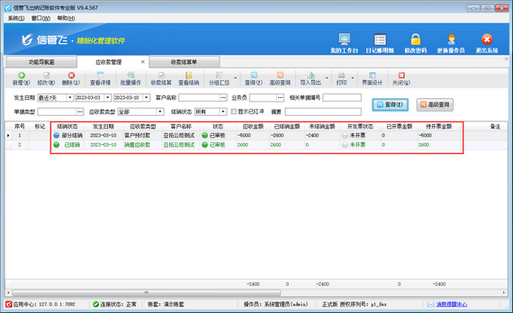 收款結算單單據審核之后,會更新銷售應收款及客戶預付款的結銷狀態,在應收款管理界面可以查看結銷情況,如下圖所示,剛新增的銷售應收款記錄已更新為“已結銷”,未結銷金額為0;剛新增的客戶預付款記錄更新為“部分結銷”狀態,未結銷金額還有-2400元,后續還可以用于沖銷銷售應收款。