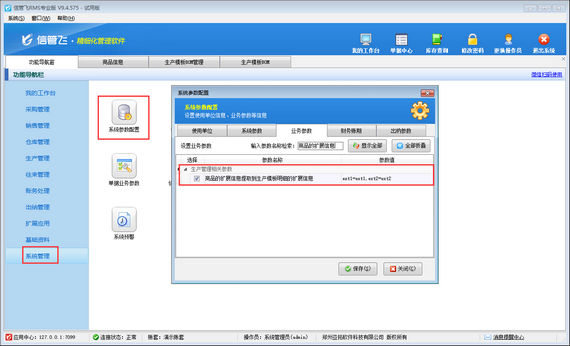 在功能導(dǎo)航窗點擊“系統(tǒng)管理”—》“系統(tǒng)參數(shù)配置”—》“業(yè)務(wù)參數(shù)”打開業(yè)務(wù)參數(shù)配置界面,然后在生產(chǎn)管理相關(guān)參數(shù)中打鉤啟用“商品的擴展信息提取到生產(chǎn)模板明細(xì)的擴展信息”參數(shù),參數(shù)值輸入相應(yīng)提取的擴展信息編號,如提取擴展信息1和擴展信息2,則需要輸入“ext1=ext1,ext2=ext2”,用英文的逗號間隔,然后點擊“保存”按鈕保存參數(shù)配置,如下圖所示。