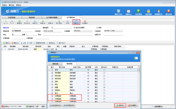設(shè)置完成后,在功能導(dǎo)航窗點擊“生產(chǎn)模板”—》“生產(chǎn)模板BOM”打開生產(chǎn)模板Bom界面,工具欄點擊“界面設(shè)計”—》“模板明細(xì)”,將“擴展信息1、擴展信息2”勾選顯示出來,如下圖所示。
