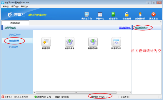 以操作員“李拓”為例,未設(shè)置操作員銷售管理相關(guān)查詢權(quán)限時(shí),操作員賬號(hào)登錄,銷售管理右側(cè)相關(guān)查詢?yōu)榭瞻祝疚囊?A title="" href="http://www.ciagame.cn/erp/index.html">信管飛RMS軟件為例演示一下操作員賬號(hào)無法查看銷售管理相關(guān)查詢,如何解決?如圖所示:
