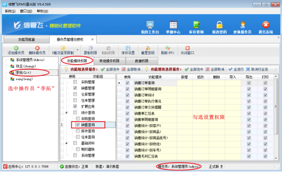 設(shè)置操作員權(quán)限:選中操作員“李拓”賬號(hào),然后在功能模塊權(quán)限中勾選設(shè)置操作員銷售查詢功能(右側(cè)默認(rèn)全部勾選,不需要的權(quán)限可取消勾選),點(diǎn)擊保存即可,如圖所示: