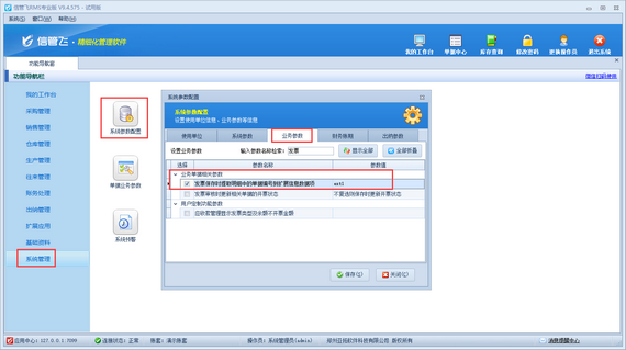 在功能導(dǎo)航窗選擇“系統(tǒng)管理”—》“系統(tǒng)參數(shù)配置”—》“業(yè)務(wù)參數(shù)”,進(jìn)入業(yè)務(wù)參數(shù)設(shè)置界面,在“業(yè)務(wù)單據(jù)相關(guān)參數(shù)”中勾選“發(fā)票保存時(shí)提取明細(xì)中的單據(jù)編號(hào)到擴(kuò)展信息數(shù)據(jù)項(xiàng)”參數(shù),并設(shè)置參數(shù)值,默認(rèn)為ext1(擴(kuò)展信息1),然后保存參數(shù)配置,如下圖所示。