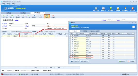 參數(shù)配置完成后,在功能導(dǎo)航窗點(diǎn)擊“往來管理”—》“銷項(xiàng)發(fā)票管理”打開銷項(xiàng)發(fā)票管理界面,點(diǎn)擊“新增發(fā)票”按鈕打開新增銷項(xiàng)發(fā)票界面,工具欄點(diǎn)擊“界面設(shè)計(jì)”將“單據(jù)主體.擴(kuò)展信息1”勾選顯示出來,然后填開發(fā)票保存后,發(fā)票關(guān)聯(lián)的銷售單單據(jù)編號(hào)即可自動(dòng)提取到“單據(jù)主體.擴(kuò)展信息1”數(shù)據(jù)項(xiàng)內(nèi)顯示,如下圖所示。
