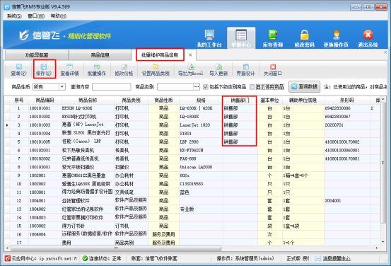 參數(shù)設(shè)置完成后,可維護商品信息,在商品信息更多操作下點擊“批量維護商品信息”,批量維護商品信息界面在對應(yīng)的銷售部門數(shù)據(jù)項選擇部門信息,輸入后點擊保存,如下圖所示: