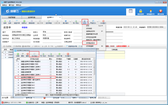 以送貨單軟件為例,打開一個送貨單,在單據界面工具欄點擊“打印”—》“打印格式設計”,在打開的打印格式設計窗口選擇需要調整的打印格式模板,然后點擊“設計格式”進入模板設計器,如下圖所示。