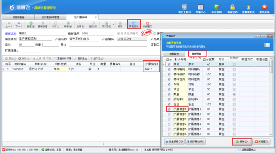 打開一個生產(chǎn)模板界面,工具欄點(diǎn)擊“界面設(shè)計”,模板明細(xì)下勾選擴(kuò)展信息1,勾選之后點(diǎn)擊保存。