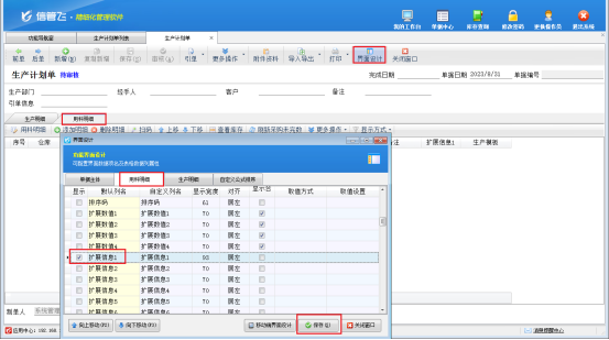 設(shè)置完成后,在功能導(dǎo)航窗點(diǎn)擊“生產(chǎn)管理”—》“生產(chǎn)計劃單”,工具欄點(diǎn)擊“界面設(shè)計”—》“用料明細(xì)”,將用料明細(xì)下的“擴(kuò)展信息1”勾選顯示出來,如下圖所示。