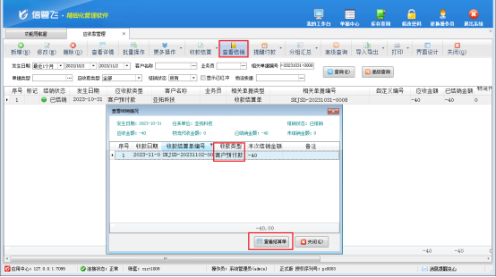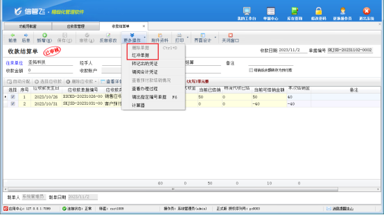 然后,選中此已結銷的客戶預付款記錄,在工具欄點擊“查看結銷”—》“查看結算單”,打開此客戶預付款的結銷記錄,更多操作下將此客戶預付款結銷記錄先紅沖后刪除,此時單據編號為“SKJSD-20231031-0008”的收款結算單即可反審修改成功,如下圖所示。