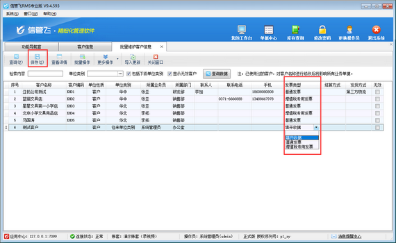進入到批量維護客戶信息界面后,依次設(shè)置每個客戶的默認發(fā)票類型,然后在工具欄點擊“保存”按鈕保存設(shè)置即可,如下圖所示: